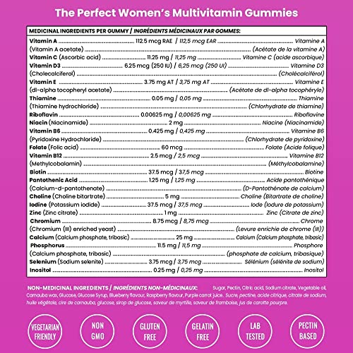 What’s Inside? A Potent blend of B Vitamins (B1, B2, B3, B5, B6), Vitamin A, C, D3, E, Choline, Methyl B12, Thiamine, Niacin, Zinc, Folate & more! Womens multivitamin gummies also include biotin for hair skin and nails & iodine for thyroid function.