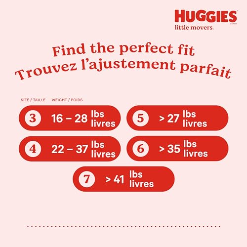 1 fitting diaper, huggies little movers disposable diapers are designed for moving babies with a contoured shape and snugfit waistband that helps eliminate gaps at the legs waist and double grip strips hold the diaper in place. Huggies’ drytouch liner absorbs wetness on contact to help keep skin clean healthy, while the absorbent leak lock system helps eliminate leaks for up to 12 hours of protection. Huggies’ pocketed waistband helps prevent diaper blowouts (nb-size 2). Plus wetness indicator let’s you know when baby is ready for a diaper change. Hypoallergenic, fragrance free, lotion free, paraben free, and free of elemental chlorine natural rubber latex. Featuring exclusive disney lion king designs and available in size 3 (16-28 lb. ), 4 (22-37 lb. ), 5 (27+ lb. ), 6 (35+ lb. ) and 7 (41+ lb. ). (wet fit, among open diapers). Buy huggies diapers and wipes with subscribe save for the best value and saving benefit. Packaging may vary from image shown.