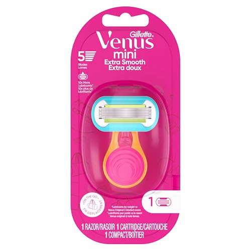 Venus female razor blades are designed with a woman’s body in mind. Venus Extra Smooth On-The-Go women’s razors come with a mini handle and travel case for on-the-go use. This razor features our Extra Smooth blade refill which delivers a close, controlled shave. The razor blade refills have 5 diamond-like coated blades, to closely cut hair with ease, for an extra smooth shave that lasts and a lubrastrip, with a touch of avocado oil, for smooth glide. Give yourself a long-lasting shave with 10x more lubrication (vs Venus Smooth). The razor blade refills also have a pivoting head that adjusts to your curves, including ankles and knees. No awkwardly angling your razor. These female razor blades cut hair closer to the skin, for a longer-lasting smooth (vs Venus Smooth razor for women). Each blade refill lasts up to 30 days of shaves (based on twice/week shave). The mini travel handle will fit any Venus razor blade refill cartridge (except Simply Venus and Venus Pubic Hair Razor). The mini handle is designed to last so you only need to change your blades.